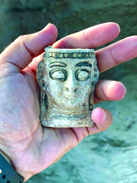 An elusive ornamented pottery head, referred to as a faience mask, was found in a collective grave of two Dilmunian women and an infant, dating back 3,300 years.