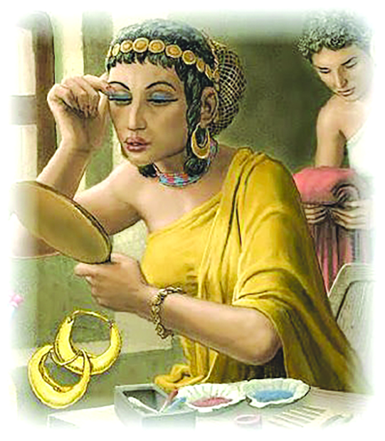 A drawing imagining how a woman would have applied eye makeup in Mesopotamian antiquity