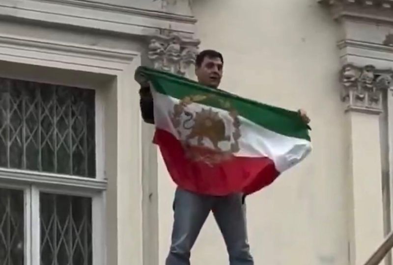 A protester climbed on to the balcony of the Iranian embassy in London and tore down the regime’s flag, the UK’s Telegraph reports.