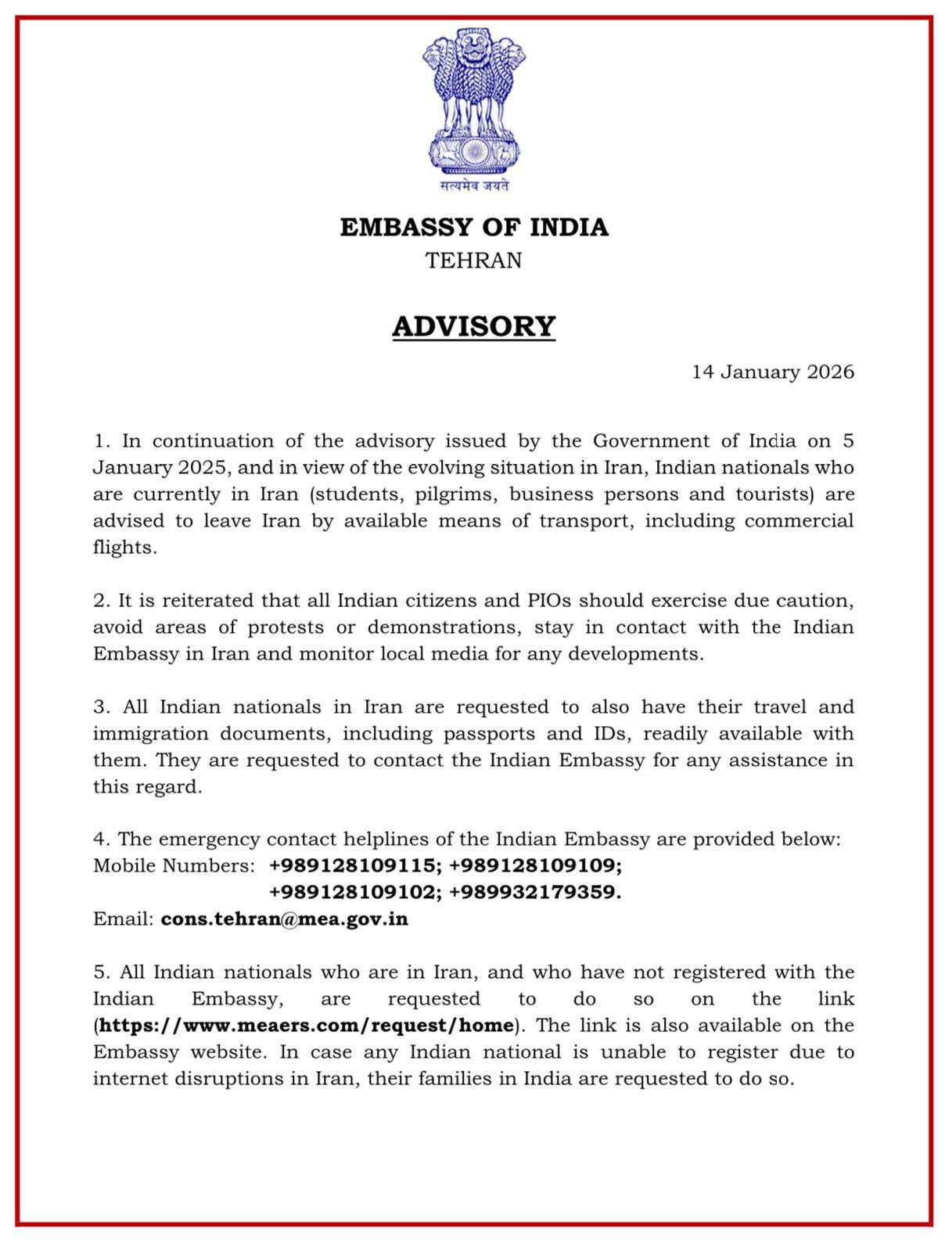 The Embassy of India in Tehran has issued an urgent travel advisory, calling on all Indian nationals currently in Iran, including students, pilgrims, business travellers, and tourists, to leave the country by available transport.