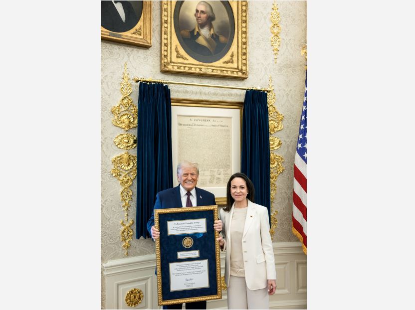 Venezuelan opposition leader Maria Corina Machado gave her medal on Thursday to Trump, who thanked her for it. The White House released a photo of Trump and Machado, with Trump holding up a gold-coloured frame displaying it, and a White House official said Trump intends to keep it.