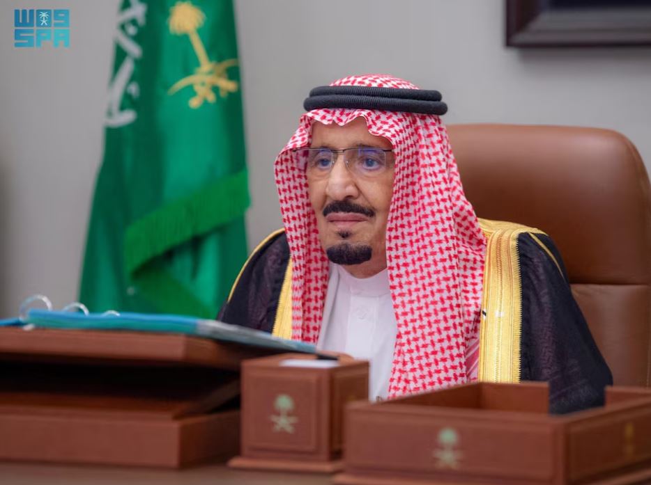 Saudi King Salman bin Abdulaziz chaired a virtual cabinet meeting from his office in Jeddah, Saudi Arabia, May 28, 2024. Saudi Press Agency/Handout via REUTERS