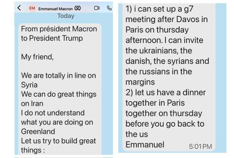 In the messages, Macron told Trump he could invite the Ukrainians, the Danes, the Syrians and the Russians to participate on the margins of the G7 meeting on Thursday, and also invited Trump to have dinner with him in Paris.