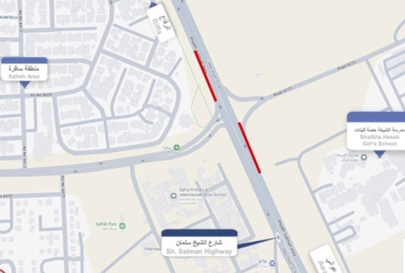 The Ministry of Works announced to the public, in co-operation with the General Directorate of Traffic, as a part of works on Shaikh Salman Highway near Safreh Junction necessitates closure of one lane on stages in both directions and one lane will be provided for the traffic movement in all directions.