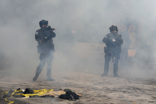 A video circulating on social media and aired on cable news stations showed people wearing masks and tactical vests wrestling with a man on a snow-covered street before shots are heard. In the video, the man falls to the ground, and several more shots are heard.