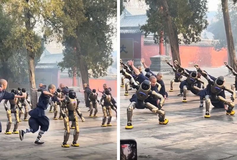Footage circulating on social media shows monks at the legendary Shaolin Temple performing martial arts drills alongside rows of humanoids. The video has elicited varied responses online, ranging from wonder to apprehension.