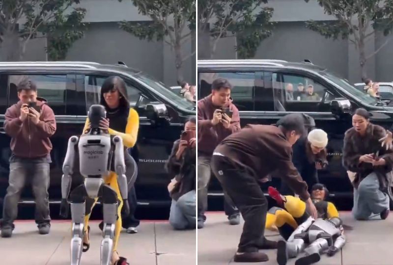 The artist spotted the robot in front of her hotel in San Francisco and decided to jokingly dance with it. However, she lost her balance and stumbled while leaning on the machine, falling to the ground before shocked onlookers helped her to her feet.