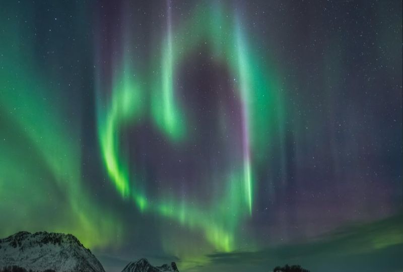 Photographer Kristoffer Vangen captured the atmospheric phenomenon over the skies of Norway. The Northern Lights, or Aurora Borealis, are formed when solar wind-charged particles collide with the Earth's magnetic field and atmospheric gases.