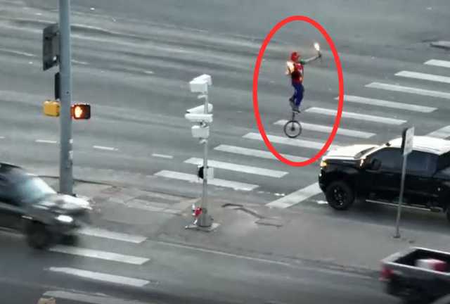 The bizarre incident happened on February 5, when a man riding a unicycle crossed a busy intersection in Colorado.