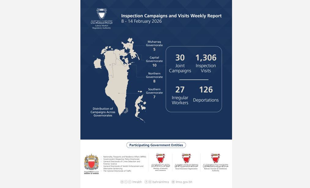 According to the Labour Market Regulatory Authority (LMRA), a total of 1,306 inspection visits were held across the kingdom from February 8 to 14 alongside 30 joint campaigns.