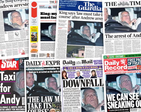 The arrest of Andrew Mountbatten-Windsor on Thursday dominated the front pages of the British Press, with many papers pulling no punches on the latest ignominious episode for the former prince, which has left the monarchy reeling.