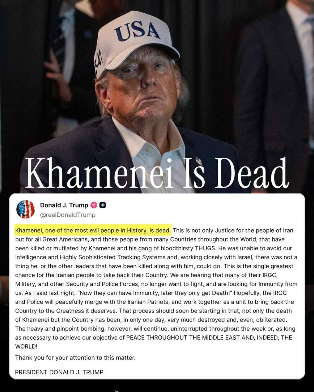 Trump, who is monitoring the operation from his Mar-a-Lago oceanfront resort in Florida, posted on Saturday afternoon that Iranian Supreme Leader Ayatollah Ali Khamenei had died in the strikes.