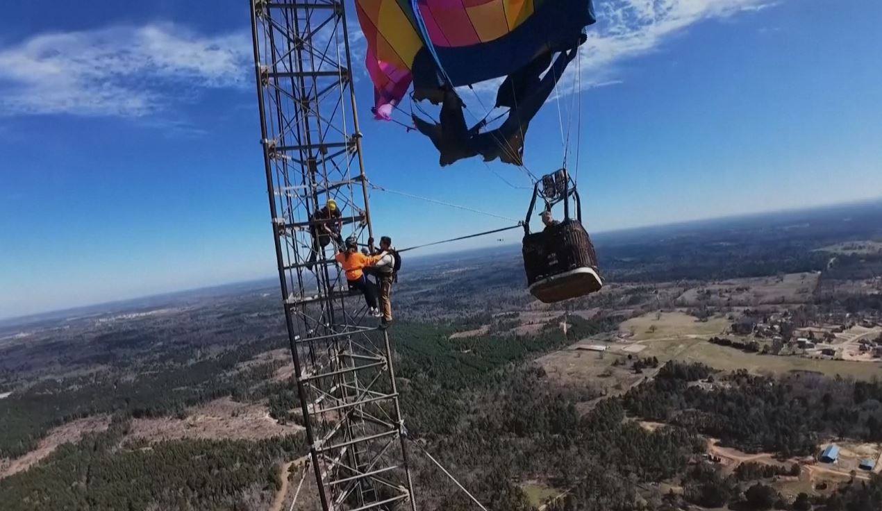 Dramatic drone video captured emergency crews rescuing people aboard a hot air balloon that had hit a cell phone tower in Longview, Texas on Saturday (February 28). Emergency crews were deployed to bring the two people on board the balloon to safety.