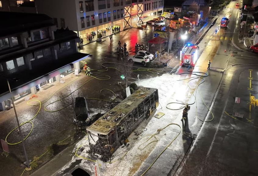 The bus was engulfed in flames on Tuesday evening on a road near the centre of Kerzers, a town of about 5,000 inhabitants in the western canton of Fribourg, about 20km from the Swiss capital Bern, police said.