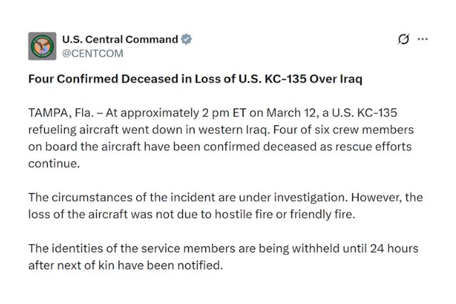 WASHINGTON - Four of the six crew members aboard a US military aircraft that crashed in western Iraq are confirmed to have been killed, the US military said on Friday, as rescue efforts continued for the remaining two.