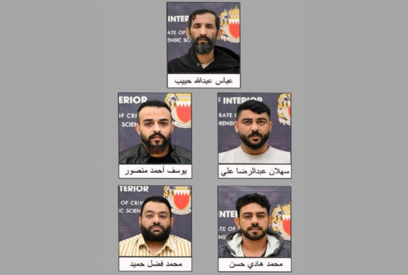 The men have been identified as Abbas Habib, Yusuf Mansoor, Sehlan Ali, Mohamed Hassan and Mohamed Fadhl. A sixth suspect, who remains unnamed, has been identified by the General Directorate of Crime Detection and Forensic Science as a fugitive.