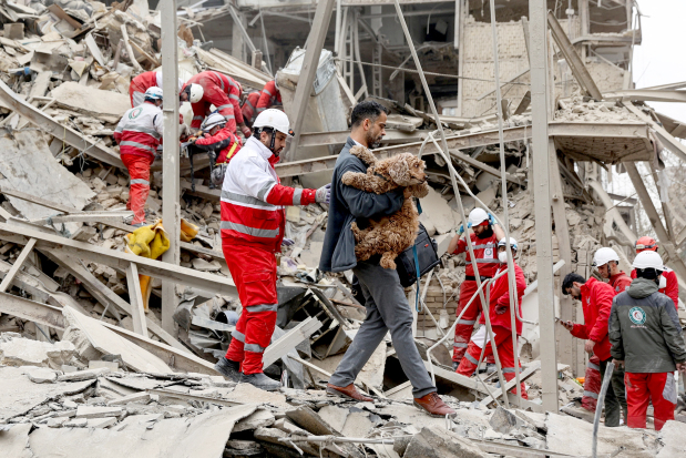 Rescue workers in Tehran worked to pull people from the wreckage of a building in what an Iranian Red Crescent aid worker said was an entirely residential alleyway.