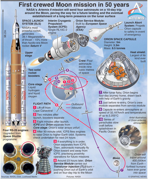 Three US and one Canadian astronaut are due for liftoff aboard Nasa’s Orion capsule and Space Launch System rocket today for a 10-day test mission swinging around the moon and back, a winding journey taking them deeper into space than humans have ever gone before.