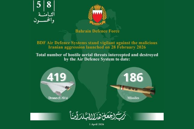 The National Communication Centre confirmed that, according to the latest updates from the General Command of the Bahrain Defence Force, 4 missiles and 19 drones were intercepted and destroyed within the last 24 hours.