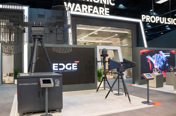 In electronic warfare, EDGE demonstrates systems to protect operations in contested electromagnetic environments. Highlights include the BORDERSHIELD autonomous border surveillance and security system, along with the GPS PROTECT 2 and GPS PROTECT 4 anti-jamming solutions.