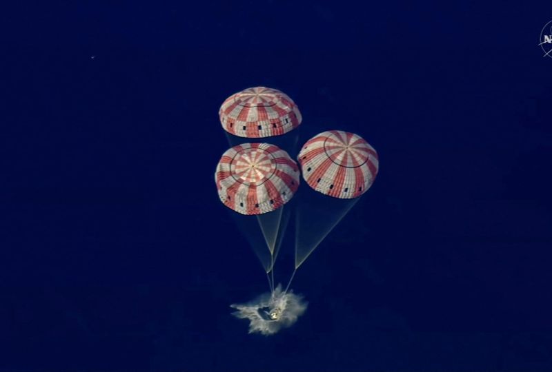 The splashdown under partly cloudy skies was carried by live video feed in a NASA webcast. "A perfect bull's eye splashdown for Integrity and its four astronauts," NASA commentator Rob Navias said moments after the landing.