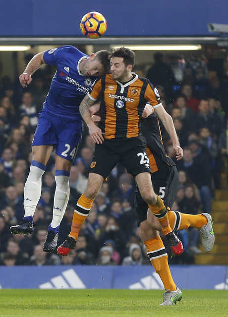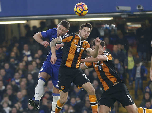 Chelsea's Gary Cahill, left, and Hull City's Ryan Mason and Hull City's Harry Maguire challenge for the ball during the English Premier League soccer match between Chelsea and Hull City at Stamford Bridge stadium in London, Sunday, Jan. 22, 2017.(AP Photo)