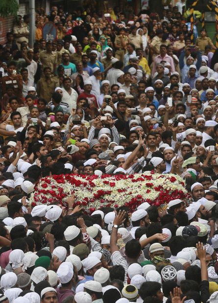 People carry the body of Yakub Abdul Razak Memon, outside his family residence during his funeral in Mumbai, India. Memon, 53, an Indian accountant and the only person sentenced to death for his role in the 1993 Mumbai bombings that killed 257 people — the country's worst terrorist attack — was hanged on his birthday, after the Indian president rejected a last-minute mercy plea amid a debate over the capital punishment.