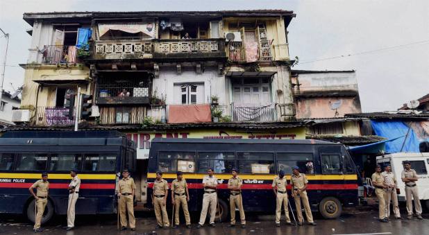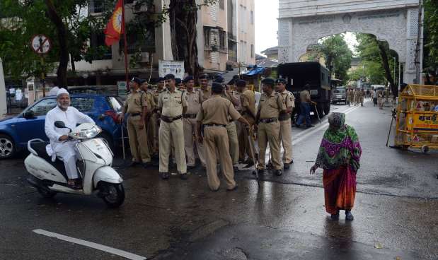 Indian police guard a road leading to the residence of Yakub Memon, a key plotter of the Mumbai bomb attacks which killed hundreds of people in 1993, in Mumbai.
