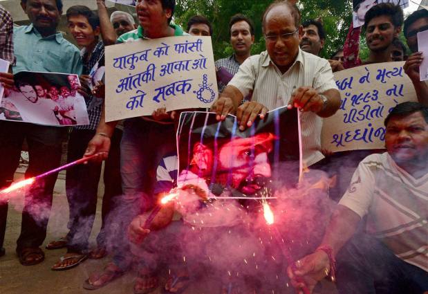 People celebrate the hanging of 1993 Bombay blast accused Yakub Memon with fire crackers in Ahmedabad.