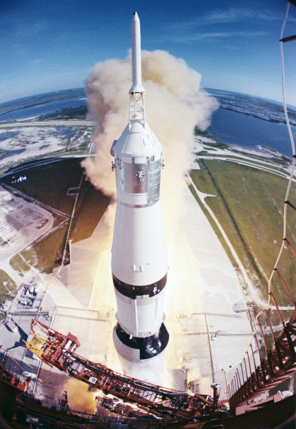 In this Dec. 21, 1968 file photo, the Saturn V Rocket with the Apollo 8 spacecraft lifts off from launch complex 39A at Cape Kennedy, Fla. The spacecraft is carrying astronauts Frank Borman, commander, James A. Lovell Jr., and William A. Anders to a seven-day mission scheduled to include 10 orbits of the moon. (AP Photo)