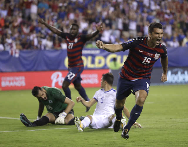 United States' Eric Lichaj (15) reacts after kicking a goal during a CONCACAF Gold Cup quarterfinal soccer match against El Salvador in Philadelphia, Wednesday, July 19, 2017. (AP Photo)