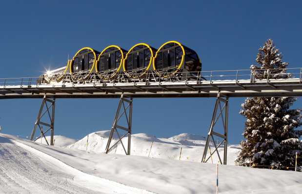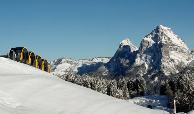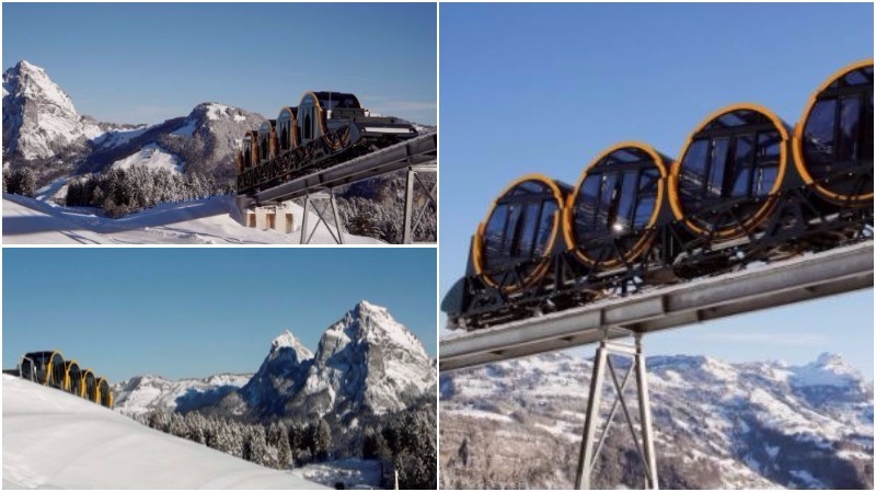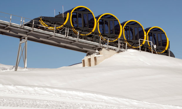The barrel-shaped carriages adjust their floors so passengers can still stand upright even as they climb towards the Alpine plateau at inclines of up to 110 percent.