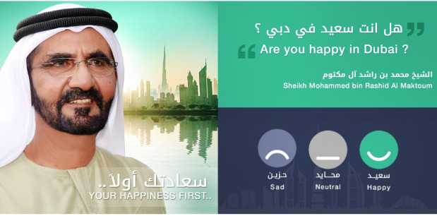 At a recent electronics show, the Dubai Police unveiled its happiness survey. It sent text messages to a number of Dubai residents including a link to a webpage showing a picture of Dubai’s ruler, Shaikh Mohammed bin Rashid Al Maktoum, with the Burj Khalifa tower behind him. It asked one question in English and Arabic: “Are you happy in Dubai?”