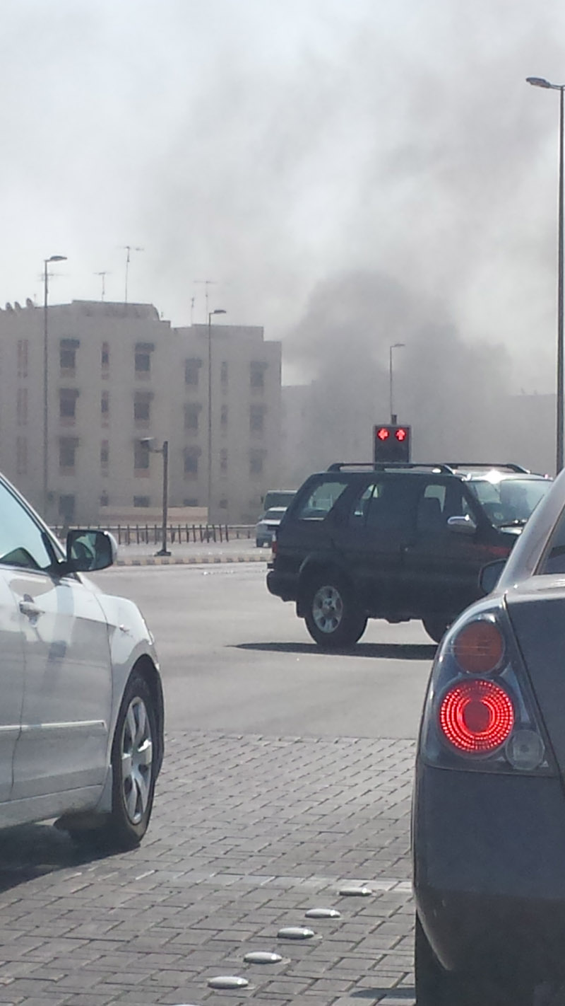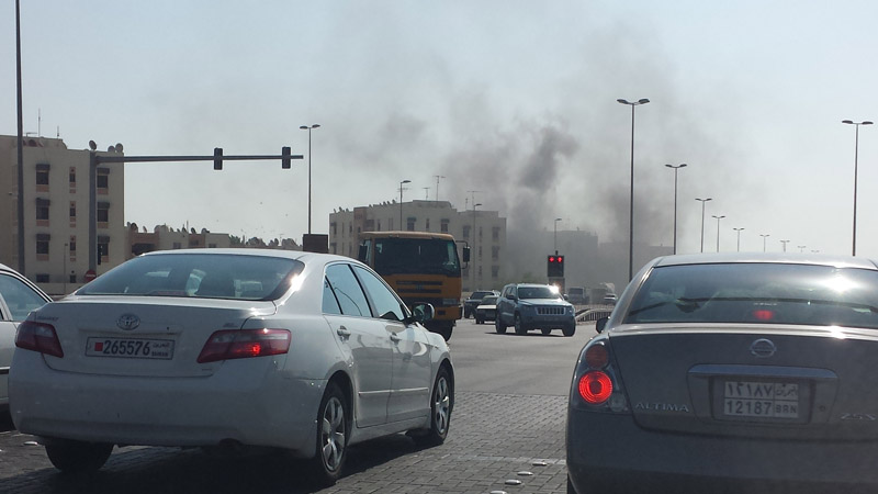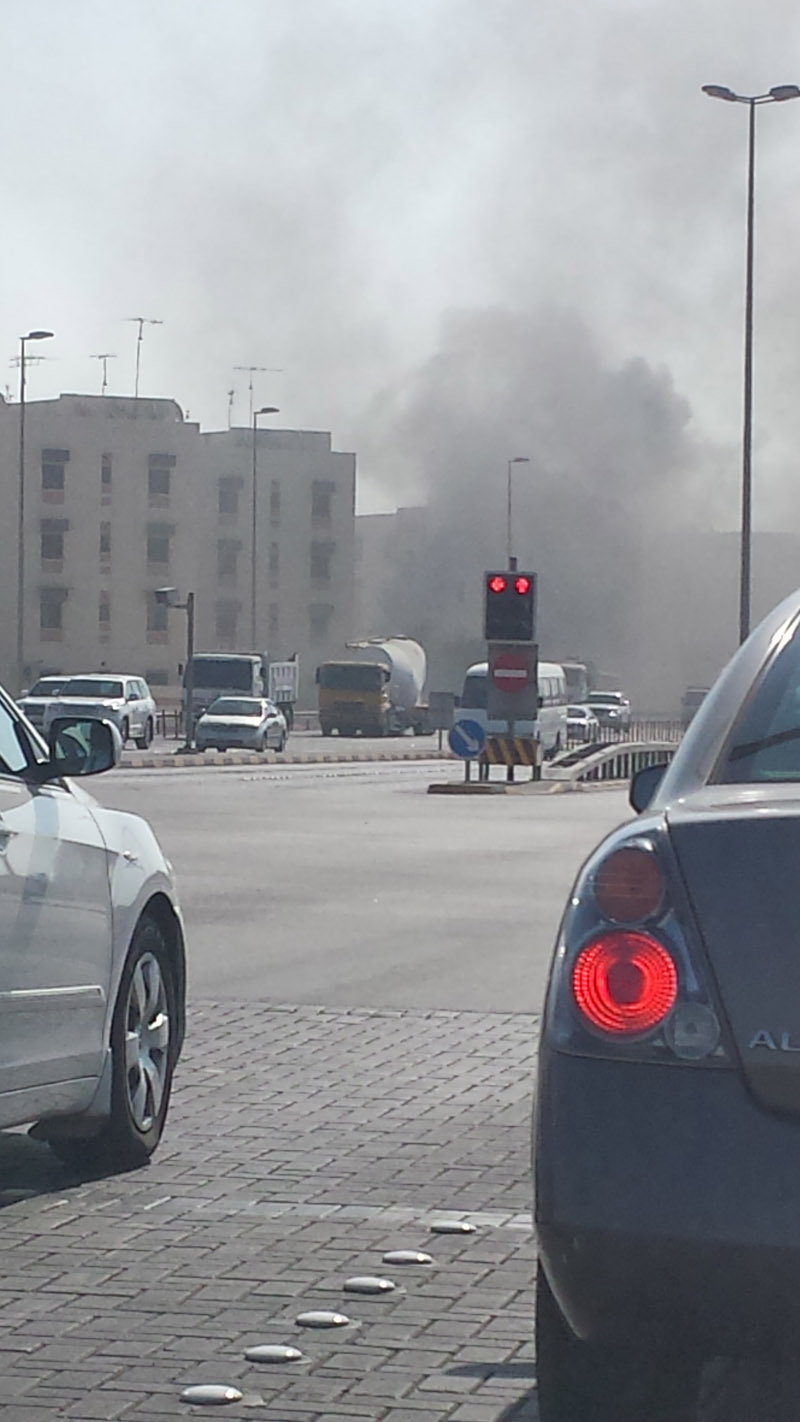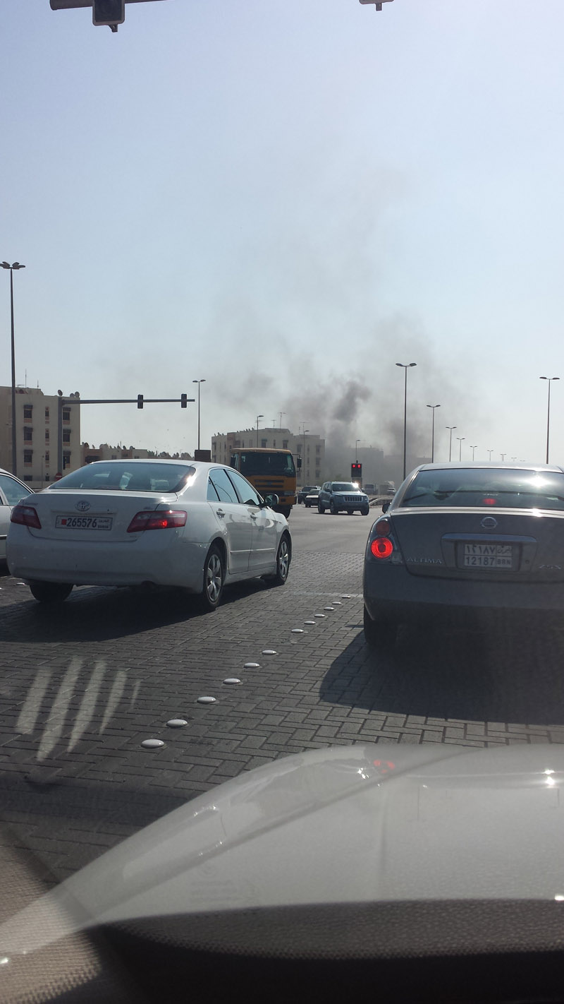 Manama: Thick black smoke was seen billowing from a building in Sanad early this morning. The cause of smoke is still unknown.More details to follow