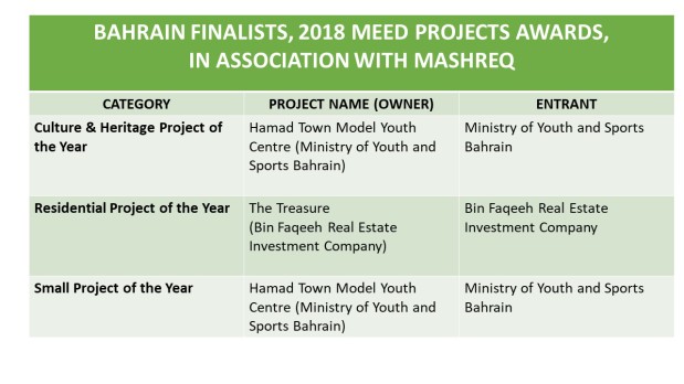Bahrain’s finalists are in the following categories: Commercial Project of the Year, Residential Project of the Year and Small Project of the Year.