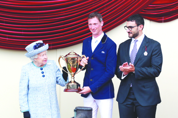 HM Queen Elizabeth and Shaikh Isa bin Salman presented the Bahrain prize to Shaikh Nasser bin Hamad Al Khalifa, HM the King’s Representative for Charity Works and Youth Affairs, Supreme Council for Youth and Sports (SCYS) Chairman and Bahrain Olympic Committee (BOC) President, on winning the Royal Windsor horse race. Trainer Ahmed Janahi received the trophy on behalf of Shaikh Nasser.