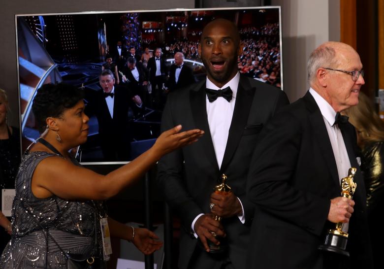Kobe Bryant reacts while being directed to the photo stage with Glen Keane after winning the Best Short Film (Animated) Award for "Dear Basketball" at the Academy Awards in Hollywood, March 4, 2018. REUTERS/Mike Blake