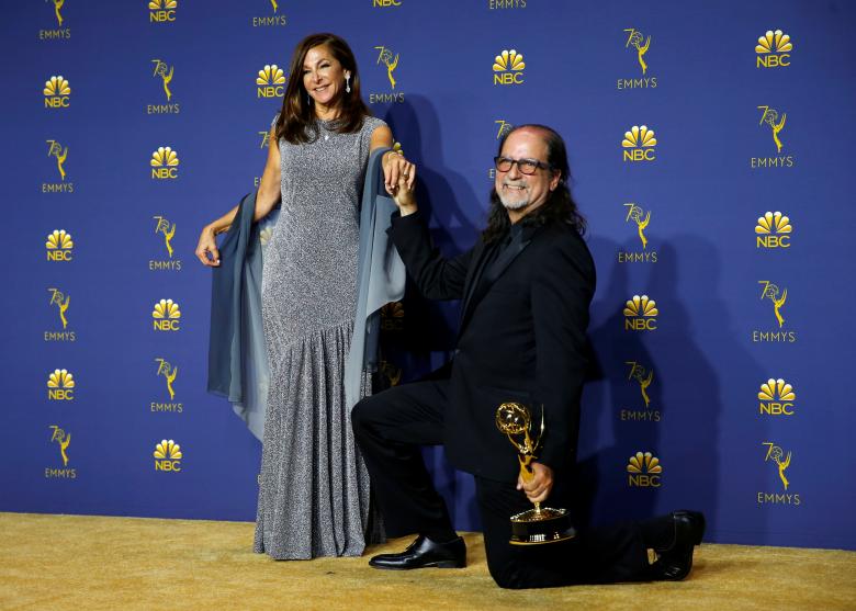 Glenn Weiss poses backstage with his Outstanding Directing for a Variety Special award for The Oscars and with Jan Svendsen, after he proposed marriage to her on stage during the show, September 17, 2018. REUTERS/Mike Blake