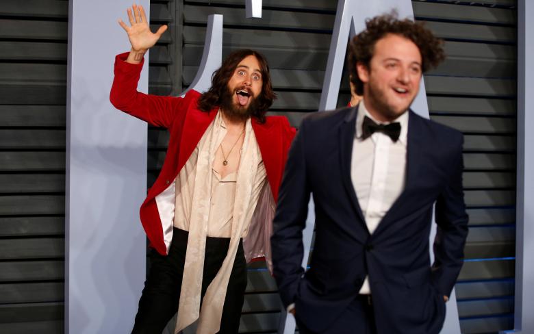 Actor Jared Leto (L) jokes around with a friend outside the Vanity Fair Oscar Party in Beverly Hills, March 3, 2018. REUTERS/Danny Moloshok