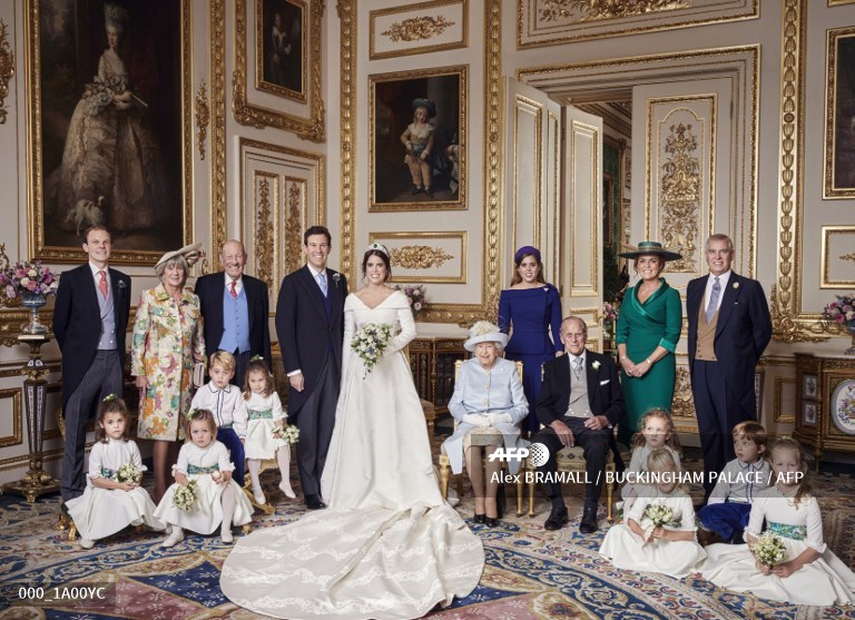 This handout official wedding photograph released by the Royal Communications of Princess Eugenie and Jack Brooksbank through Buckingham Palace on October 13, 2018 shows Britain's Princess Eugenie of York (CR) and her husband Jack Brooksbank (CL) posing in the White Drawing Room, Windsor Castle, on October 12, 2018 with (L-R bank row) Thomas Brooksbank; Nicola Brooksbank; George Brooksbank; Princess Beatrice of York; Sarah, Duchess of York; Britain's Prince Andrew, Duke of York, (L-R middle row) Prince George of Cambridge; Princess Charlotte of Cambridge; Britain's Queen Elizabeth II; Britain's Prince Philip, Duke of Edinburgh; Maud Windsor; Louis De Givenchy; (L-R front row) Theodora Williams; Mia Tindall; Isla Phillips; and Savannah Phillips. Alex BRAMALL / BUCKINGHAM PALACE / AFP
