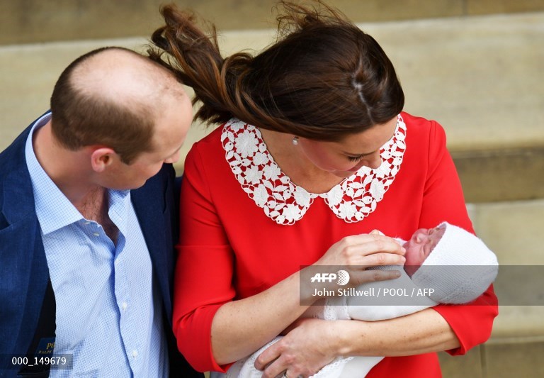 Britain's Prince William, Duke of Cambridge (L) and Britain's Catherine, Duchess of Cambridge (R) show their newly-born son, their third child, Britain's Prince Louis of Cambridge to the media outside the Lindo Wing at St Mary's Hospital in central London, on April 23, 2018. Britain's Prince William accompanied his wife Catherine as she left hospital after giving birth to a baby boy, the couple's third child who is fifth in line to the British throne. John Stillwell / POOL / AFP