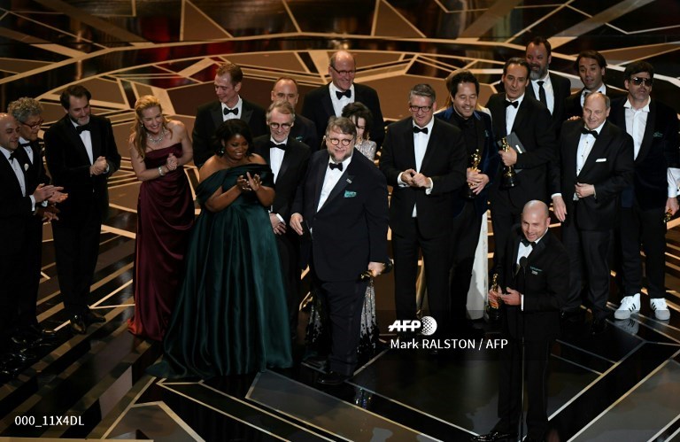 Mexican director Guillermo del Toro (C) stand on stage with his cast and crew after he won the Oscar for Best Film for "The Shape of Water" during the 90th Annual Academy Awards show on March 4, 2018 in Hollywood, California. Mark RALSTON / AFP