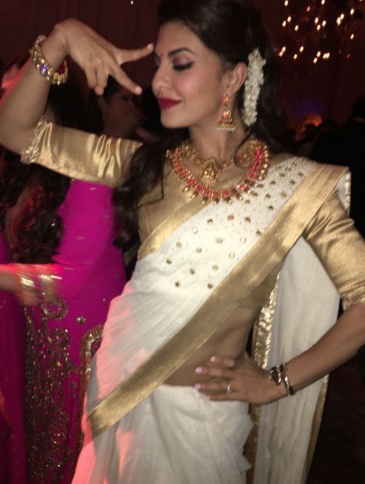 Jacqueline dressed as a South Indian for Asin and Rahul's reception.