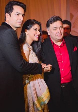 Veteran actor Rishi Kapoor poses with the couple.