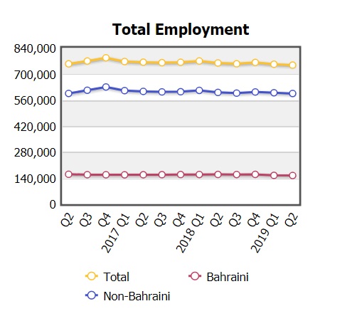 The figures released by the Labour Market Regulatory Authority (LMRA) also state that employment of Bahraini nationals reached 153,103 by the end of the second quarter of this year, decreasing by 3.6pc compared to 158,814 workers in the second quarter of 2018.