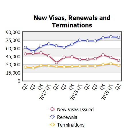 An infographic on the drop in issuance of new visas, renewals and terminations