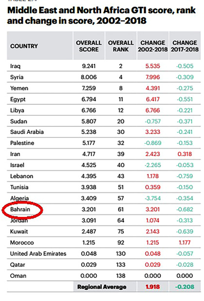 Bahrain’s overall terrorism score in the index was 3.201 out of 10 (with 10 being the worst).