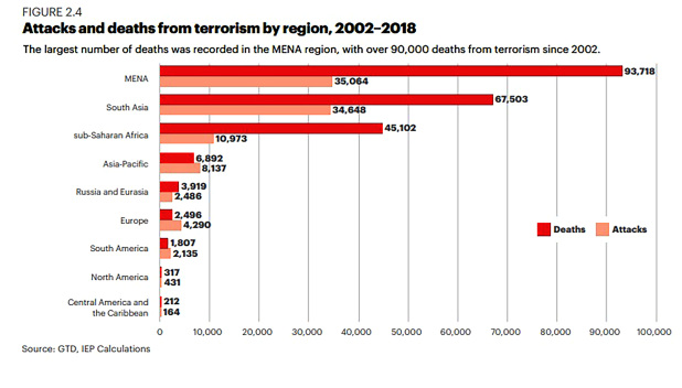 Most deaths from terrorism have occurred in the Middle East and North Africa (Mena) region, which accounts for 93,718 terrorism fatalities since 2002.