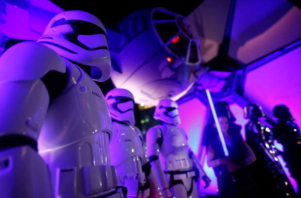 Staff waving glowing light sabers guided premiere attendees, among them "Star Wars" royalty Daisy Ridley and Mark Hamill, to a ceremonial blue carpet under a large tent, outfitted to resemble a spaceship hangar beneath a star-lit sky. Replicas of three X-wing Starfighters dangled overhead.