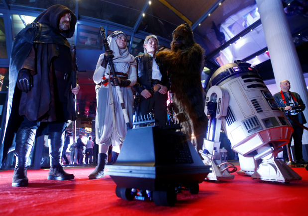 At Monday's premiere, superfans dressed as favorites from the heroine scavenger Rey to bounty hunter Boba Fett and villain Darth Vader. Hamill received a standing ovation when he was introduced, as did composer John Williams.